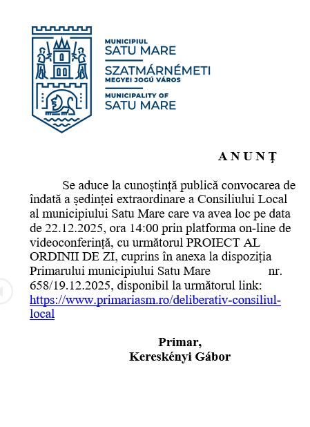Se aduce la cunoștință publică convocarea de îndată a ședinței extraordinare a Consiliului Local al municipiului Satu Mare care va avea loc pe data de 22.12.2025, ora 14:00 prin platforma on-line de videoconferință, cu următorul PROIECT AL ORDINII DE ZI, cuprins în anexa la dispoziția Primarului municipiului Satu Mare nr. 658/19.12.2025, disponibil la următorul link: https://www.primariasm.ro/deliberativ-consiliul-local