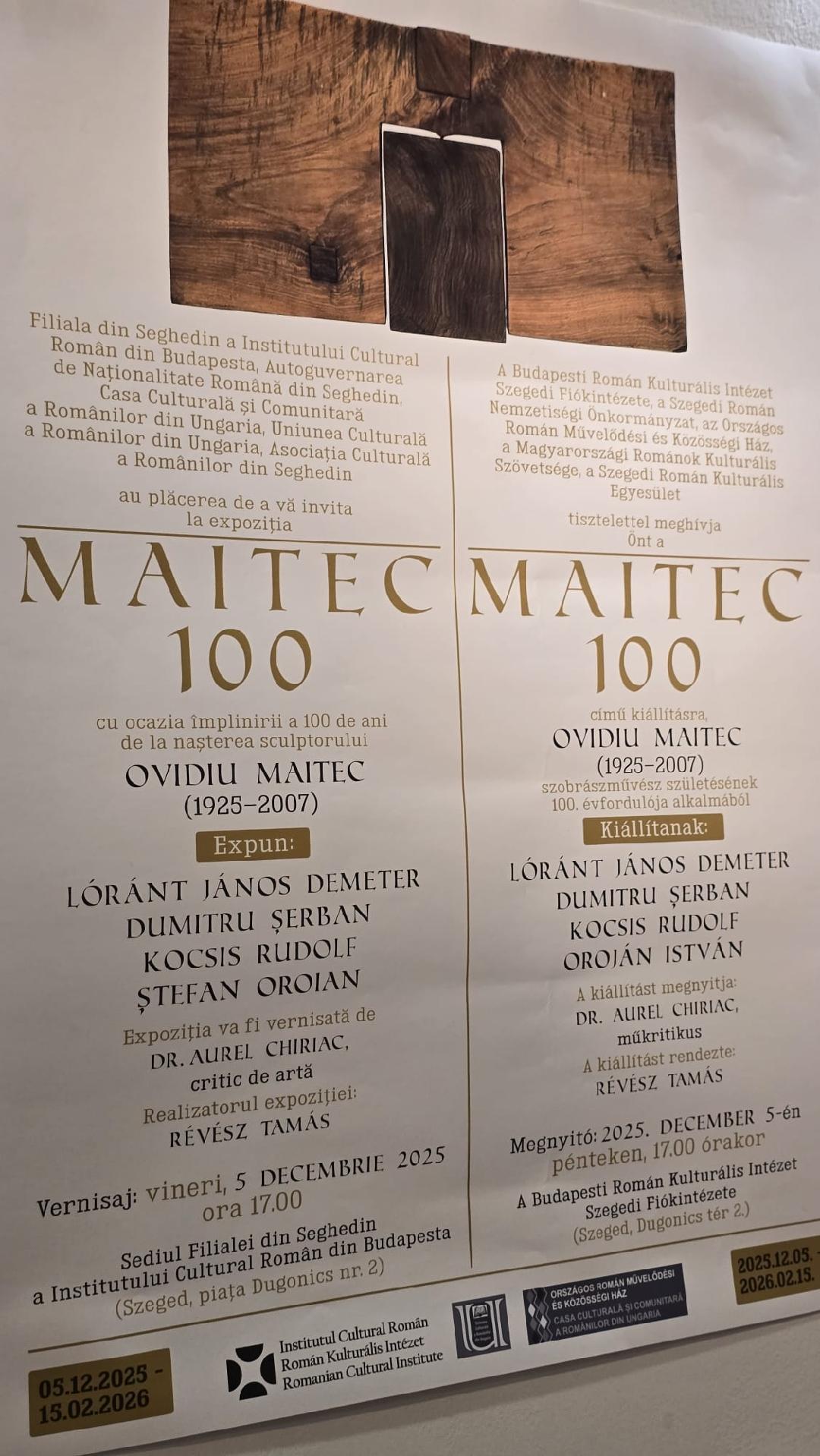 În perioada 5 decembrie 2025 – 15 februarie 2026, Filiala din Seghedin (Szeged) a Institutului Cultural Român Budapesta găzduiește o expoziție care aduce în prim-plan figura emblematică a sculptorului Ovidiu Maitec (1925-2007), născut la Arad, dar și moștenirea sa culturală, la o sută de ani de la naștere. Expoziția „Maitec 100” reunește lucrări de sculptură, grafică și pictură a patru artiști contemporani – Ștefan Oroian și Lóránt János Demeter, din Ungaria, alături de Dumitru Șerban și Rudolf Kocsis, din România – care aduc un omagiu sculptorului și prin lucrări realizate special pentru acest proiect.