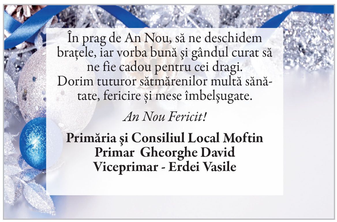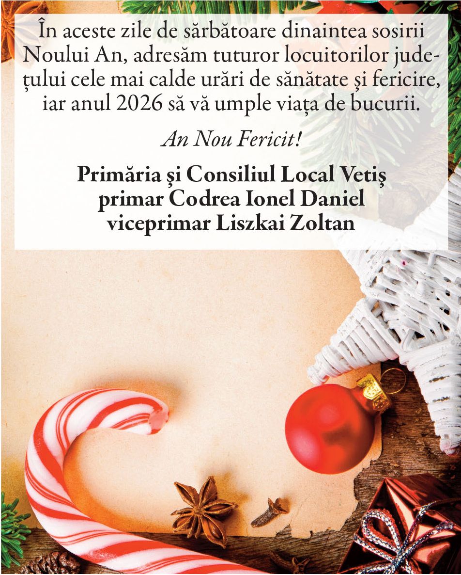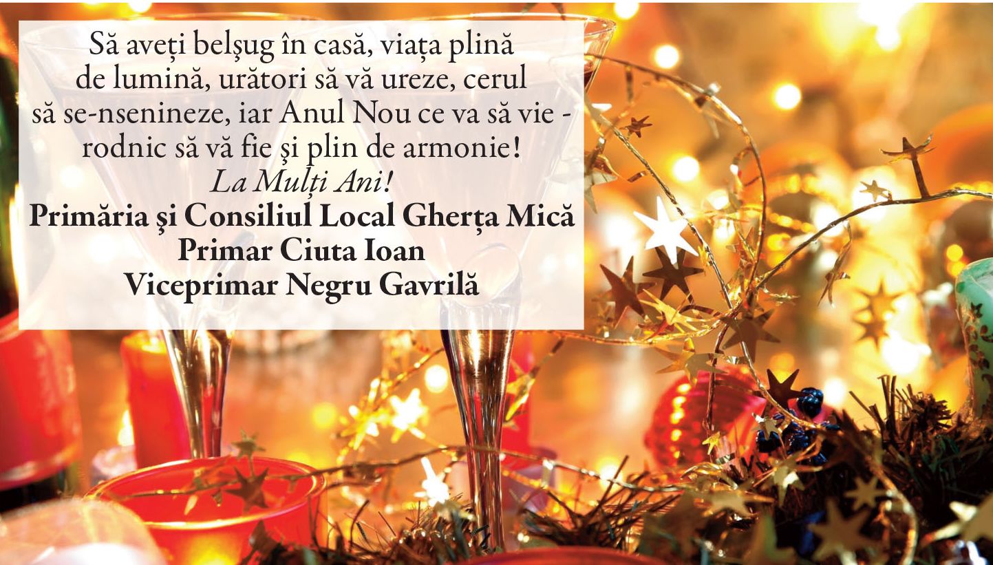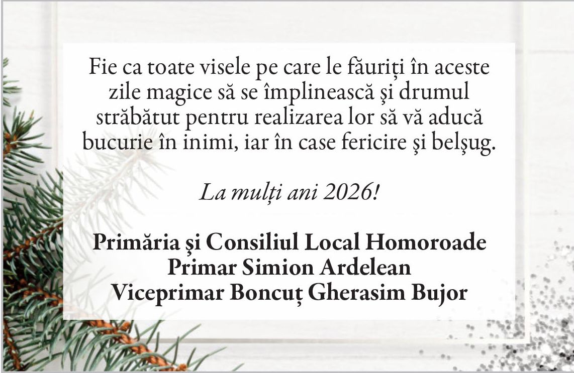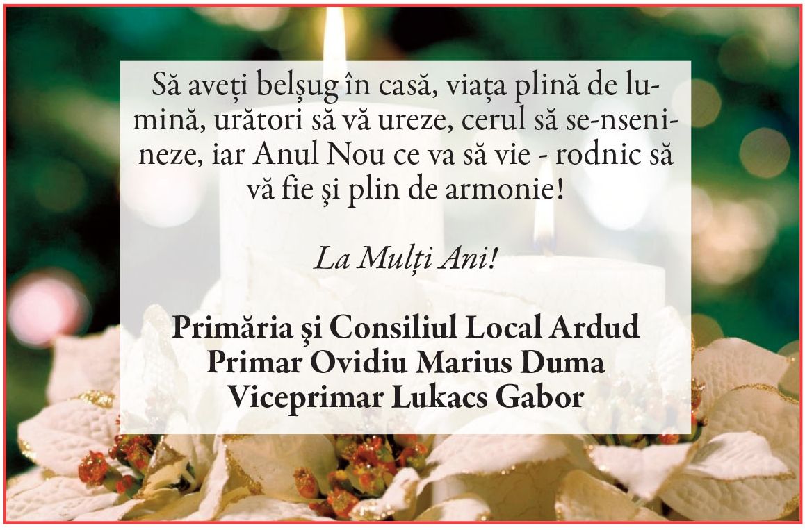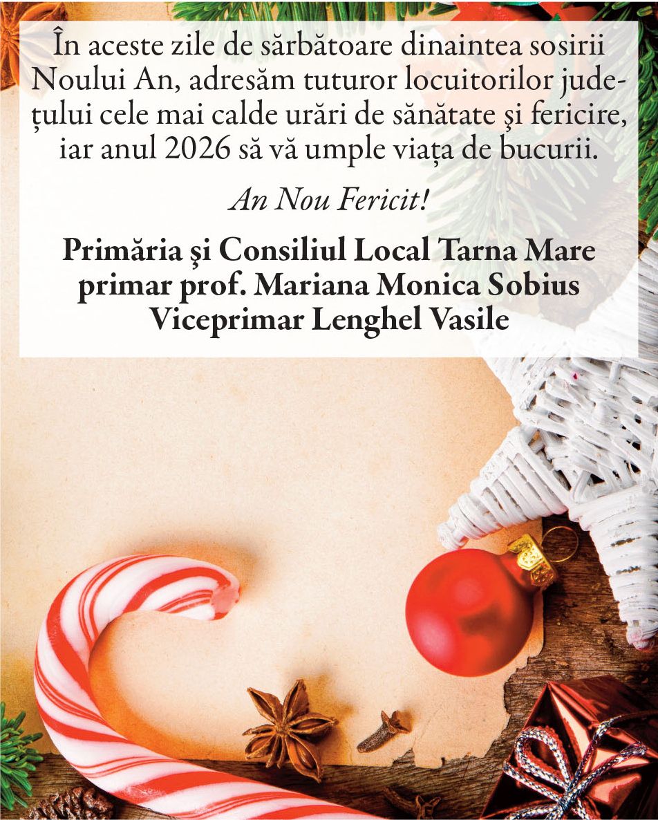 Felicitări de AN NOU 2026 - Primării! Locale • 31.12.2025 00:00 |||||||||||||| Distribuie: Primește ziarul gratuit pe email! Abonează-te și citești ziarul Gazeta Nord-Vest zilnic, gratuit. Abonează-te Acasa Locale Felicitări de AN NOU 2026 - Primării! Articole Similare Locale Activități dedicate Zilei Mondiale a Apei. Concurs de desen, experimente și lecții despre natură pentru elevii din Medieșu Aurit acum 18 ore Locale Campania APIA 2026 – clarificări privind eliberarea adeverințelor necesare fermierilor pentru obținerea subvențiilor acum 18 ore Locale Acțiune de amploare a polițiștilor în Ardud și Beltiug: amenzi de peste 57.000 de lei și lemn confiscat acum 18 ore Locale Împreună hrănim speranța: Federația Băncilor pentru Alimente dă startul celei de-a 14-a ediții a Colectei Naționale de Alimente în Lidl, PENNY, Auchan, Kaufland și Profi acum 19 ore Locale „Maratonul poveștilor”, la Biblioteca Județeană Satu Mare, de Ziua Internațională a Cărții pentru Copii și Tineret acum 20 ore Locale Polițiștii locali intensifică acțiunile împotriva cerșetoriei în Satu Mare acum 20 ore Ultimele Articole Locale Complexul de Educație Ecologică „Casa verde” din Grădina Romei, a fost gazda festivității de lansare a unui nou proiect de mediu cu titlul: GRĂDINIȚE SALVATOARE DE RÂURI acum 13 ore Locale Viceprimarul Cristina Tămășan Ilieș felicită Poliția Locală. Acțiuni intensificate împotriva cerșetoriei în Satu Mare acum 13 ore Locale Peste 10.000 de cărți electronice de identitate emise în Satu Mare. Viceprimarul Raul Băbțan: „Digitalizarea devine realitate” acum 13 ore Locale Deputatul Mircea Govor: Bugetul României a fost adoptat. Investiții importante pentru județul Satu Mare acum 13 ore Locale Cea mai mare creșă din Satu Mare, aproape de finalizare: 110 locuri pentru copii acum 13 ore Locale Deratizare în Satu Mare, în perioada 23–27 martie 2026. Avertisment pentru populație acum 14 ore Cele mai citite 1 Complexul de Educație Ecologică „Casa verde” din Grădina Romei, a fost gazda festivității de lansare a unui nou proiect de mediu cu titlul: GRĂDINIȚE SALVATOARE DE RÂURI 2 NORD VEST TV. Slăbitul cu injecții, între speranță și risc. Avertismentul unui medic gastroenterolog din Satu Mare 3 Viceprimarul Cristina Tămășan Ilieș felicită Poliția Locală. Acțiuni intensificate împotriva cerșetoriei în Satu Mare 4 Cea mai mare creșă din Satu Mare, aproape de finalizare: 110 locuri pentru copii 5 APASERV. Grupa Albinuțelor de la Grădinița 14 Mai a descoperit drumul apei Din aceeasi categorie Complexul de Educație Ecologică „Casa verde” din Grădina Romei, a fost gazda festivității de lansare a unui nou proiect de mediu cu titlul: GRĂDINIȚE SALVATOARE DE RÂURI acum 13 ore Viceprimarul Cristina Tămășan Ilieș felicită Poliția Locală. Acțiuni intensificate împotriva cerșetoriei în Satu Mare acum 13 ore Peste 10.000 de cărți electronice de identitate emise în Satu Mare. Viceprimarul Raul Băbțan: „Digitalizarea devine realitate” acum 13 ore Deputatul Mircea Govor: Bugetul României a fost adoptat. Investiții importante pentru județul Satu Mare acum 13 ore Cea mai mare creșă din Satu Mare, aproape de finalizare: 110 locuri pentru copii acum 13 ore Ultimele stiri Complexul de Educație Ecologică „Casa verde” din Grădina Romei, a fost gazda festivității de lansare a unui nou proiect de mediu cu titlul: GRĂDINIȚE SALVATOARE DE RÂURI acum 13 ore Viceprimarul Cristina Tămășan Ilieș felicită Poliția Locală. Acțiuni intensificate împotriva cerșetoriei în Satu Mare acum 13 ore Peste 10.000 de cărți electronice de identitate emise în Satu Mare. Viceprimarul Raul Băbțan: „Digitalizarea devine realitate” acum 13 ore Deputatul Mircea Govor: Bugetul României a fost adoptat. Investiții importante pentru județul Satu Mare acum 13 ore Cea mai mare creșă din Satu Mare, aproape de finalizare: 110 locuri pentru copii acum 13 ore