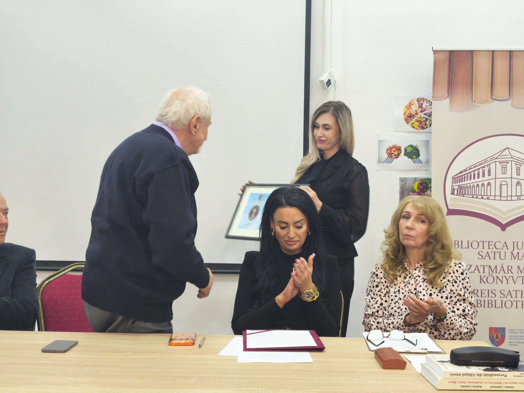 Un moment special al manifestării a fost marcat de Roxana Petca, vicepreședintele Consiliului Județean Satu Mare, care i-a înmânat scriitorului diploma aniversară „Senior al literelor sătmărene”, în semn de recunoaștere a contribuției sale la viața culturală a județului.