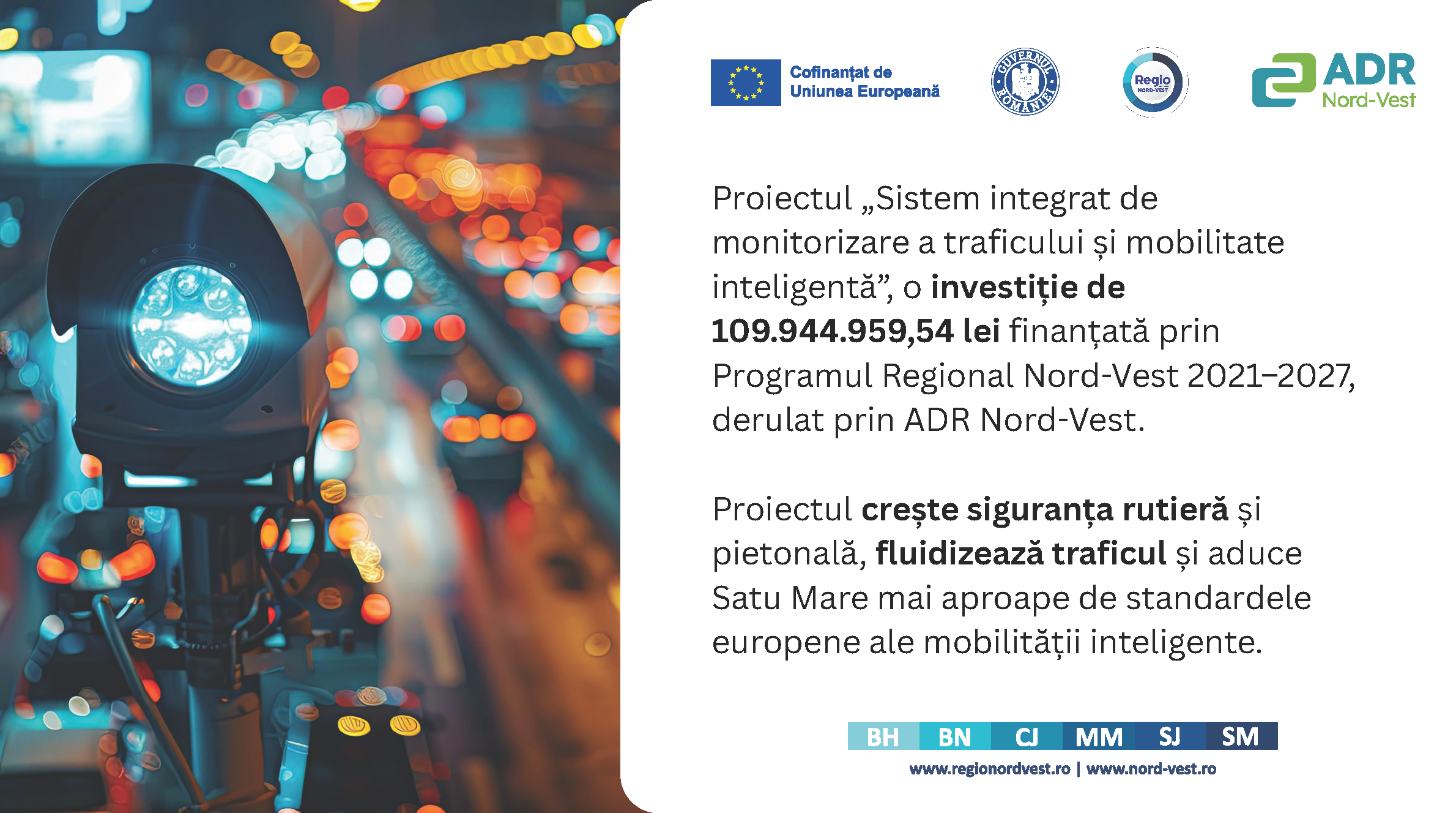 Municipiul Satu Mare face un pas major spre un oraș mai sigur, mai verde și mai eficient, prin implementarea proiectului „Sistem integrat de monitorizare a traficului și mobilitate inteligentă în Municipiul Satu Mare”, finanțat din fonduri europene. Investiția, în valoare totală de 109,9 milioane de lei (peste 22 milioane de euro), vizează modernizarea infrastructurii de trafic și a transportului public, cu impact direct asupra calității vieții sătmărenilor.