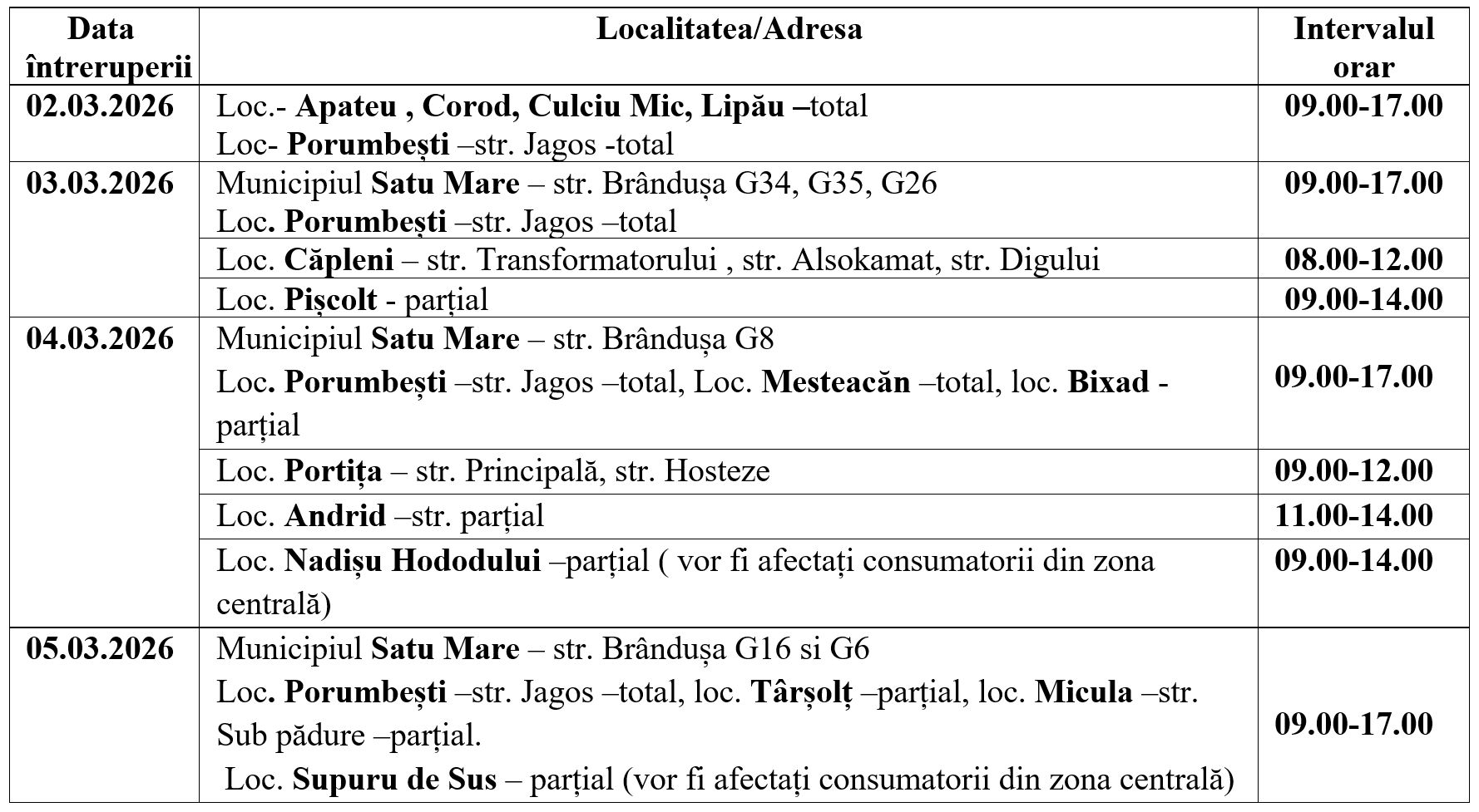 DISTRIBUȚIE ENERGIE ELECTRICĂ ROMANIA S.A. - Sucursala Satu Mare anunţă întreruperea alimentării cu energie electrică: