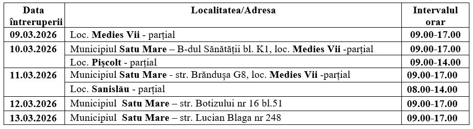 DISTRIBUȚIE ENERGIE ELECTRICĂ ROMANIA S.A. - Sucursala Satu Mare anunţă întreruperea alimentării cu energie electrică: