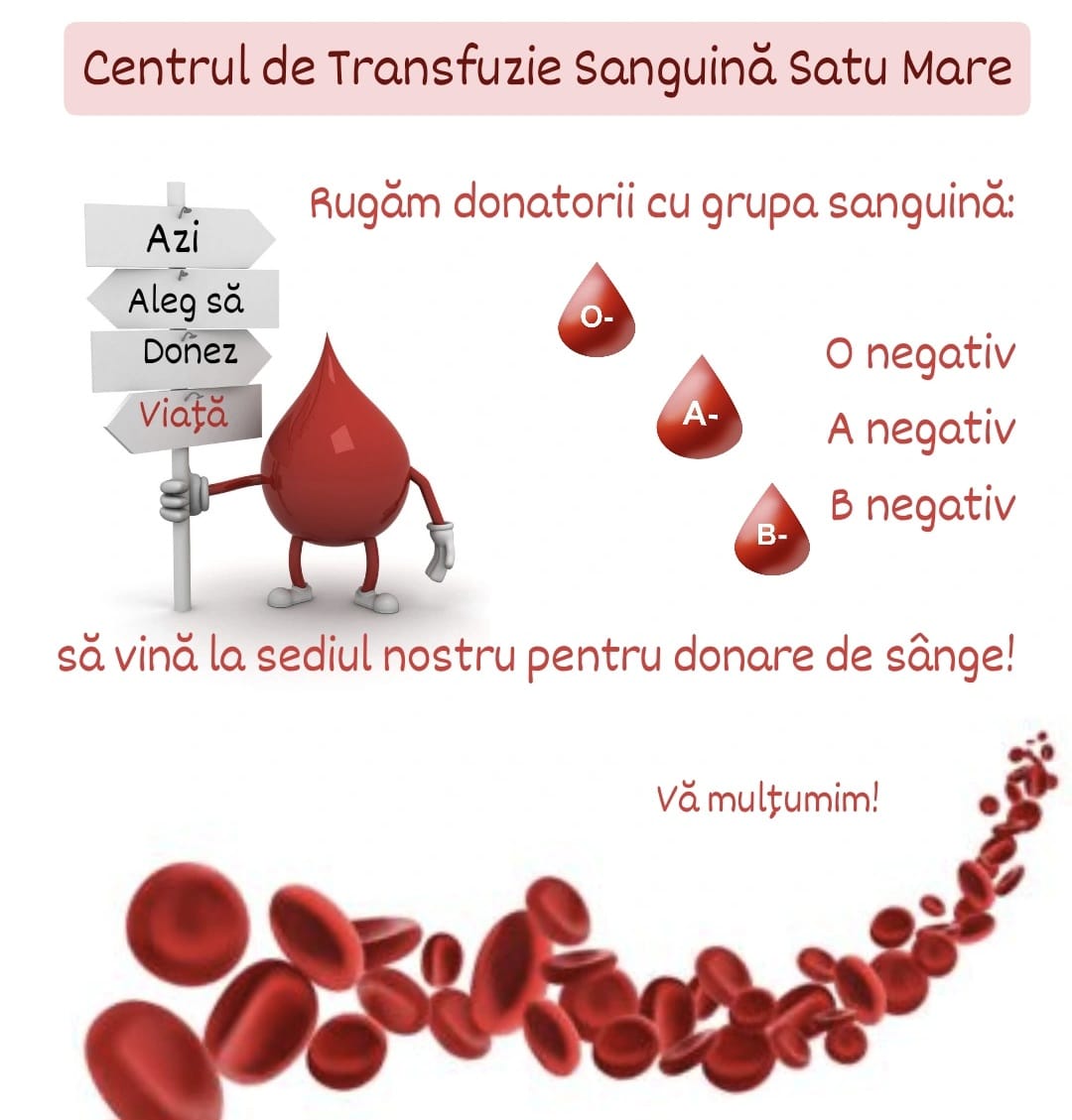 Potrivit Centrul de Transfuzie Sanguină Satu Mare, este nevoie în mod special de donatori cu grupele: